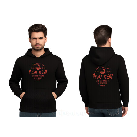 This cotton fleece pullover hoodie brings quirky streetwear style to your casual wardrobe. Featuring a bold graphic print inspired by Chinatown NYC's iconic Faw Kew Chinese cuisine and takeout establishment, this hoodie makes a playful statement wherever you go. The design showcases vintage-inspired typography with Chinese characters and a distinctive bowl graphic, printed on both the front and back for maximum visual impact. Crafted from comfortable cotton fleece material, this hoodie offers warmth and softness perfect for everyday wear. The classic pullover style features a spacious kangaroo pocket at the front for keeping your hands warm or storing small essentials, whilst the adjustable drawstring hood provides extra coverage when needed.
